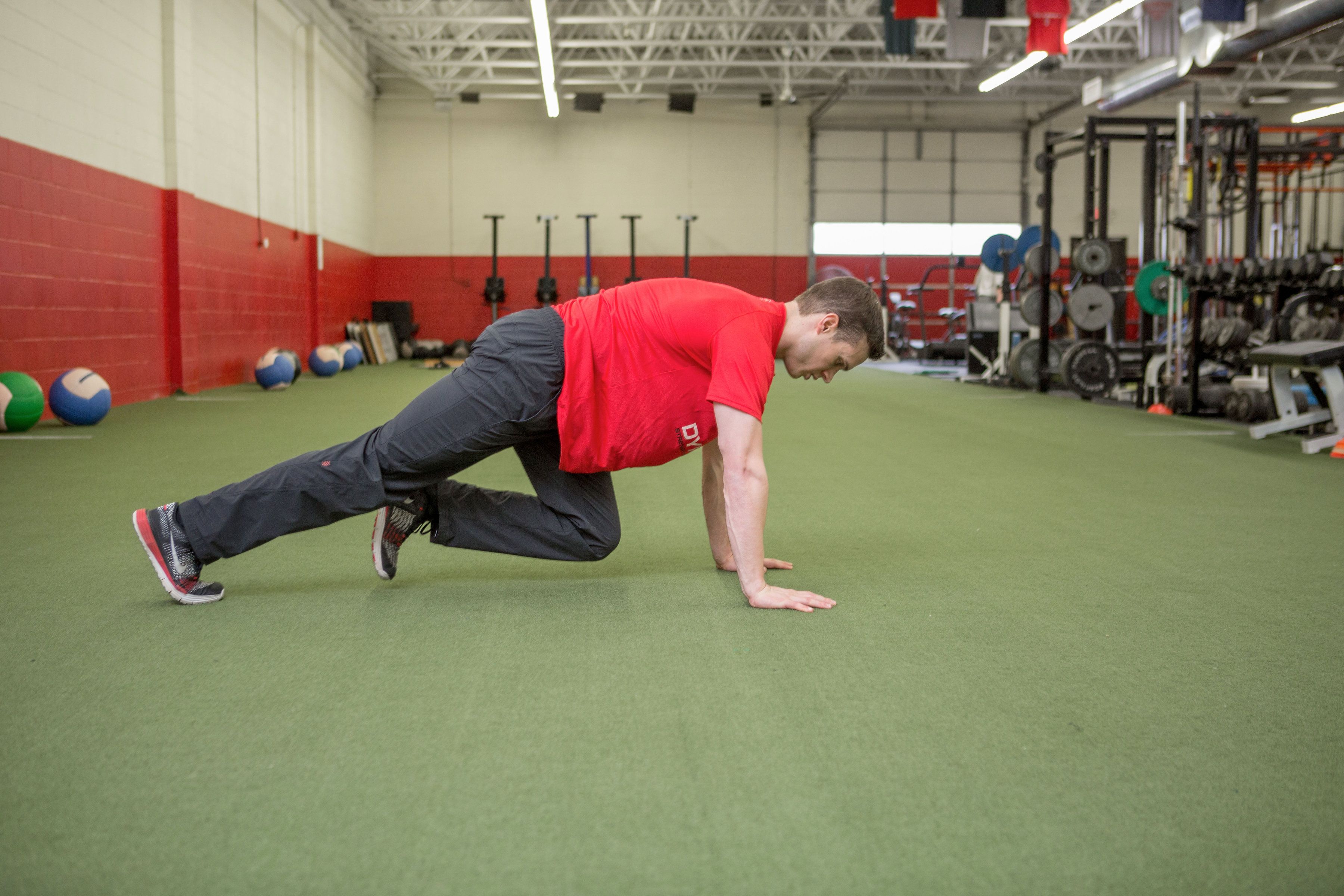Step 2 brace your core and drive one knee to the mid line of your body.