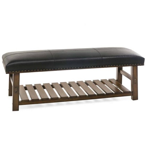 Canyon Brown Leather And Wood Bench With Slatted Bottom Shelf