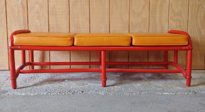 Vintage Modern Ficks Reed Rattan Bench With 3 Seat Cushions By